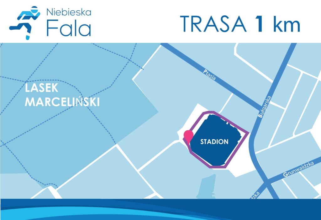 Na startujących w Niebieskiej Mini Fali na dystansie 1 km czeka trasa, która poprowadzi wokół Enea Stadionu, dzięki czemu młodzi biegacze będą mogli poczuć prawdziwą sportową atmosferę wydarzenia. Trasa jest bezpieczna, czytelnie oznaczona i dostosowana do możliwości najmłodszych uczestników.